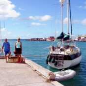 We left Aitutaki yesterday at high tide, kissing the bottom several times on the way out. Still, it wasn’t bad. We motor sailed all the way and got to Avatiu Harbor, Avarua, Roratonga around 12:30 p.m. The seas were mild and wind very light on the passage. It was easy going. We’re in a very odd spot in the harbor too. Basically, we’re med-moored (Tahiti style) to a corner of the wharf. It about the only place we could go. Our stern faces the corner and we have two anchors off the front and all our fenders off the back. It took us an hour to anchor, but finally we’re dug in. We toured the town and it’s quite charming. There is a bit of traffic compared to Aitutaki, but the town is much more appealing than Papette. As we toured, the shops were closing. Tomorrow they’re only open until noon and everything is closed on Sunday. Monday is a holiday. The day off in celebration of the Queen’s Birthday. However, the actual celebration is Saturday, June 17. Go figure. We’ll see what we can get done tomorrow. We need diesel. We found out yesterday that our two jerry cans of fuel are gasoline not diesel. So, we have to get rid of the gas and fill the cans with diesel. Ferry them to the boat, fill the tank and repeat. We have taken care of our port and immigration paperwork so we can leave on Sunday or Monday. We didn’t want to wait for the holiday to be over for us to go on to Niue. We’re a bit behind our original schedule and are anxious to get going.