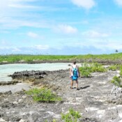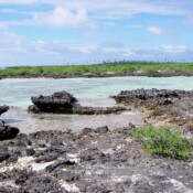 I got my wish today. Steve took Susan and I on the dinghy over to the “bird island” and we said we’d make our way back to shore near the boat and call him on the portable VHF radio to come get us. We didn’t walk far before seeing a very small black tip reef shark in the shallows. He swam off. We explored the island, seeing lots of birds with them checking us out in return. They don’t have much human contact so they’re curious and swoop down to see what we are. The juvenile boobies are probably the most daring, although the noddys came pretty close too. Fairy turns, lesser Frigate birds and red tail tropic birds were also around.We made our way back to the main island of this atoll by a combination of hiking over lava rock and wading. I’ve not waded in the ocean much and it was great fun.