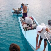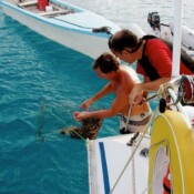 I came back to the boat and soon Susan traded positions with me and I got to use the dive hookah. It’s like diving but without the tank on your back. A compressor is up at the surface in the dinghy and two people can dive to a depth of about 25 feet. A line comes down and into a regulator just like a dive regulator. We stayed down most of an hour and by then I was completely a prune. We saw many neat things and it’s fun to get up close to things that you can’t when snorkeling. Cleaner wrasses normally clean other fish but kept checking us out, especially Steve’s calves. One actually tugged on his rear pocket a little.
