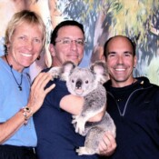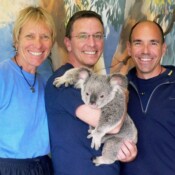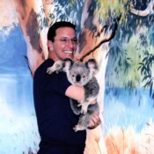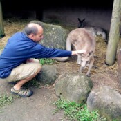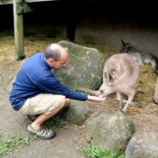 Kuranda Koala Gardens was our final stop. As we stopped to look at the koalas a handler came in and one was particularly anxious to be choosen to be held. You could tell she was thinking “pick me, pick me.”  Howard was reticent to hold her, as she had just pooped when the handler came to pick her up. Chibby was her name. I talked him into cuddling her for a picture and I’m sure he enjoyed it. Here they let you hold the koala a lot longer than elsewhere and Chibby was quite a bit bigger than the one we held at Billabong. After his offical shot they let us take our own pictures and then join in for a group shot. Chibby was happy as a clam to be held. We were encouraged to pet her after the pictures, the whole time Howard holding her.