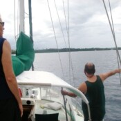 We also have other on-board residents. Shssh, don’t tell the agriculture inspectors! Two geckos are on board. What they’re living on we can’t fathom. Maybe they can catch some of these flies. We put out small pools of jam for them to eat, trying to keep them going. The first one hadn’t been seen in a week until the night before last. Then yesterday, I found a second one; he jumped on my leg as I stood in the galley. Why do they always jump on you and scare the life out of you? Geeze. I took him up to the cockpit to join the other gecko. He’s much smaller, so I’m certain it’s a second one.