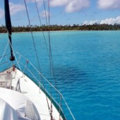 Last night after our dinner of duck breast, yellow wax beans, fried green tomatoes and hockey puck corn muffins the sky started to light up with lightening. It was far off and pretty sight. The stars above were amazing. I could even see the Magellenic Cloud. It’s just a round whisp of light in the sky even in the binoculars. However it is two galaxies each the size of the Milk Way superimposed on each other. Of course, the Milky Way was in view. Not the candy bar. Although we did have a bit of chocolate for dessert. A few hours later the storm had moved over us and the boat was rocking and rolling. We had anchored in sand which is a pretty good place to anchor. Still, we were worried about dragging the anchor and ending up grounded or hitting coral heads damaging the boat. The winds really picked up along witht he waves. The bow of the boat where I was sleeping in the v-berth groaned with the sound of the chain bouncing. I got up twice to adjust it to try and lower the noise. Apparently though, I slept through the worst of it when Susan and Steve were up contemplating our circumstances.