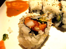 Our third dish was the deep fried scallop roll sushi. It was amazing. The took small chunks of scallop or small bay scallops and deep fried the to be the center of this roll. Also inside was asparagus, nori and probably other things I didn’t look for. Howard called this one a definite re-order. I have to agree. It came with a sauce that looked like miso, but I also like it